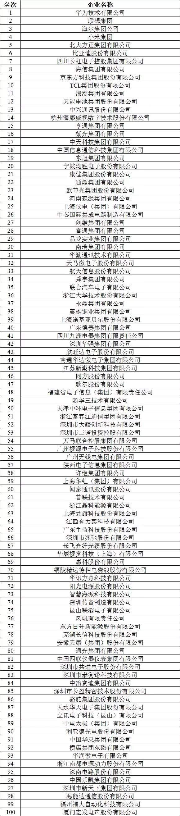 2019年(第33届)电子信息百强企业名单